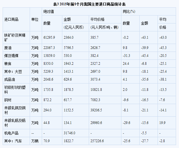 六、原油、粮食、成品油等主要大宗商品进口量增加,主要进口商品价格普遍下跌。前8个月,我国进口铁矿砂6.13亿吨,微降0.2%,进口均价为每吨385.7元,下跌43%;原油2.21亿吨,增加9.8%,进口均价为每吨2626.7元,下跌45.3%;煤1.39亿吨,减少31.3%,进口均价为每吨382.4元,下跌20.5%;成品油2048.6万吨,增加4.1%,进口均价为每吨3073.4元,下跌38.1%;初级形状的塑料1735.8万吨,增加2%,进口均价为每吨1.08万元,下跌13.5%;钢材872.2万吨,减少9.6%,进口均价为每吨7082.3元,下跌7.6%;未锻轧铜及铜材294万吨,减少8.1%,进口均价为每吨3.92万元,下跌14.1%。