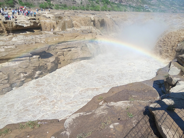 13日早晨,我们乘车前往世界第一大黄色瀑布——黄河壶口瀑布。黄河壶口瀑布位于山西吉县城西25公里处的晋峡峡谷之中,黄河壶口瀑布声形粗犷,气势壮观,以它排山倒海的雄姿而闻名中外。“听之若雷霆之鸣,望之若虹霓直射”,形成“谷涧起雷”、“群龙戏浪”、“水里冒烟”、“彩虹通天”四大奇观。