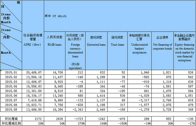 初步统计,2015年前三季度社会融资规模增量为11.94万亿元,比去年同期少5786亿元。其中: