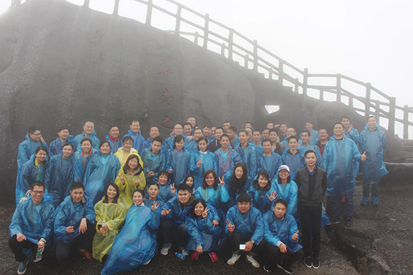 第二天一早,在韩总的带领下,大家开始攀登华南第一峰。由于阴雨天气,当天的雾气特别的大,整个猫儿山都被浓雾包围着,能见度不足十米。经过近一个小时的攀登,终于到达最高峰,浓雾再次将华南第一峰“吞噬”其中。若隐若现的猫儿山,在雾气中更加的神秘莫测,在大雾中有点“犹抱琵琶半遮面”的感觉,颇有几分仙气。