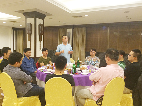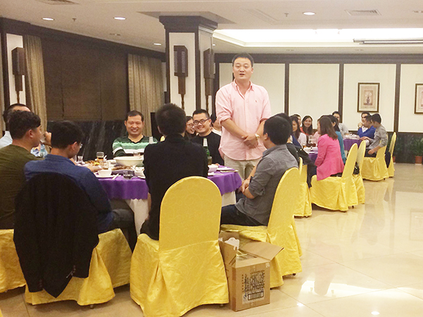 夜幕降临驱车赶往兴安县入住桂林乐满地度假酒店,并准备开始晚宴。晚宴由广西分公司总经理谭运鹏主持,他首先感谢了集团CEO、总裁韩晓和几位兄弟公司老总参加广西万乘的五周年活动并且邀请韩总发言。韩总发言说到,广西分公司从当年成立初期的三个人发展到今天的规模,并且业绩一直处于集团第一梯队,在经济不发达的广西,实属不易。他希望在谭总的带领下,广西万乘能够再创佳绩。