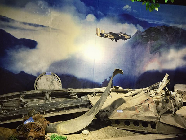 接着我们参观了“飞虎队”战机残骸展览馆,该展览馆主题是“飞虎归巢——中美合作搜寻猫儿山美军飞虎队失事飞机纪实”,馆内陈列的展品包括飞机的机翼、螺旋桨、雷达、仪表等残骸及失事飞行员的皮鞋、手枪、急救包等遗物,是1996年10月,在猫儿山“仙愁崖”发现的美军援华抗日“飞虎队”B—24重型轰炸机残骸。该机从“飞虎队”柳州基地起飞轰炸停泊在台湾港口的日军军舰后返航,在改降秧塘机场过程中而突然失事的。后来,当地政府先后在猫儿山铁杉公园的路边,修建和树立了美军B—24飞机失事记事碑及机组人员雕像,并在灵渠“四贤祠”开设陈列馆,对公众展出失事飞机的部分残骸,以供人们纪念这些反法西斯英雄,铭记这段中美两国人民联手与日本法西斯作战的历史。