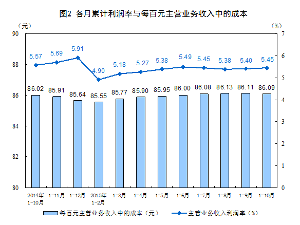 1-10月份,规模以上工业企业实现主营业务收入893727.9亿元,同比增长1%;发生主营业务成本769374.2亿元,增长1.1%。