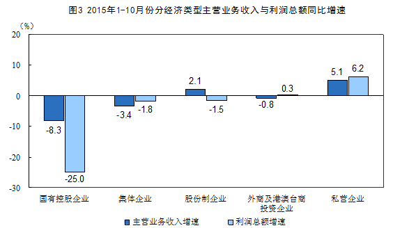 规模以上工业企业中,1-10月份国有控股企业实现利润总额9080.6亿元,同比下降25%;集体企业实现利润总额395.3亿元,下降1.8%;股份制企业实现利润总额32698.7亿元,下降1.5%;外商及港澳台商投资企业实现利润总额12082.9亿元,增长0.3%;私营企业实现利润总额17511亿元,增长6.2%。