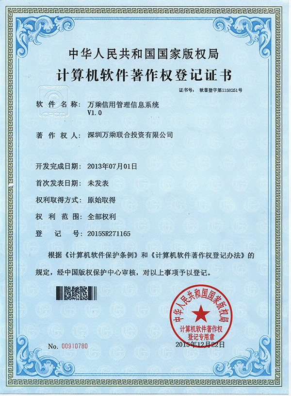 新年伊始,万乘金融服务集团投入巨资自主开发,并拥有完全自主产权的信用管理信息系统荣获国家版权局颁发的《计算机软件著作登记证书》。 该操作系统上线两年多来,通过逐步完善和改进,已成为国内催收行业中最先进的应用系统。本次获颁证书,标志着万乘集团知识产权保护和信息化建设又迈上一个新台阶。