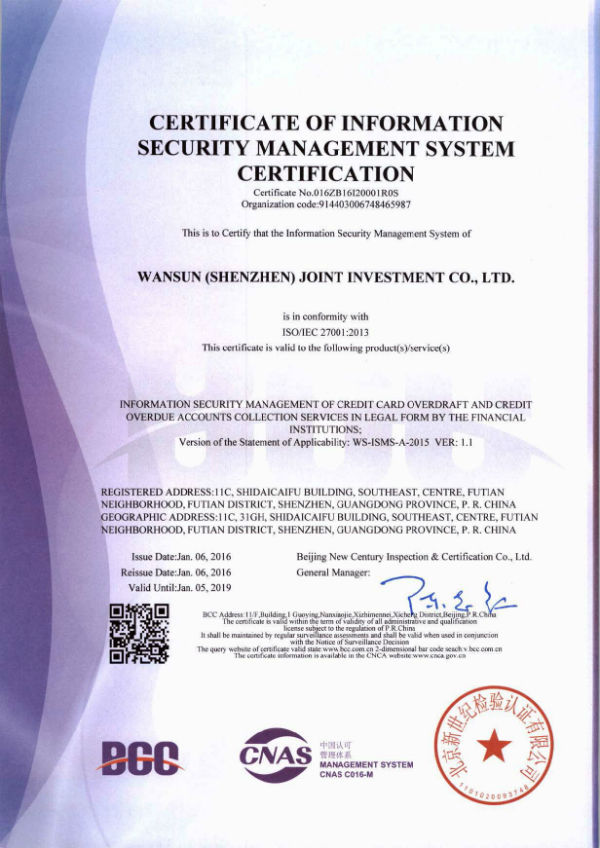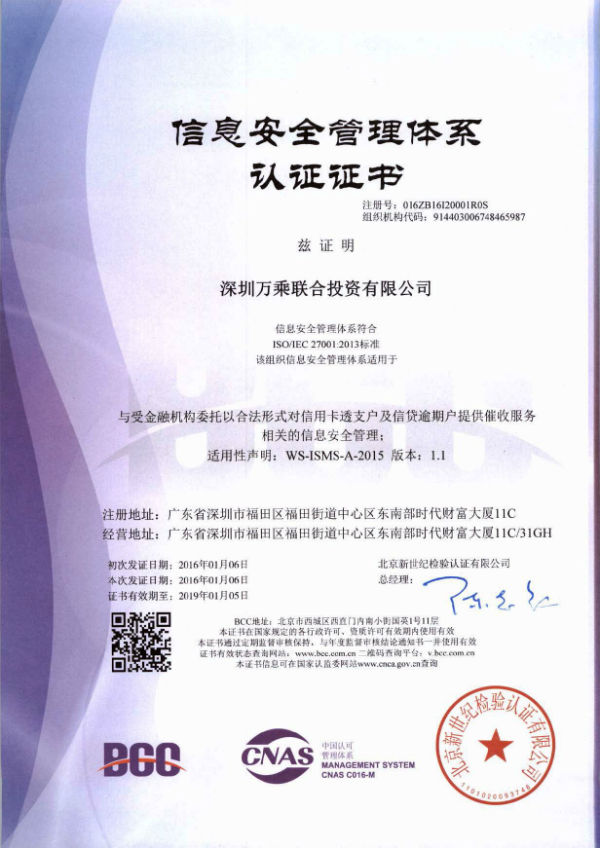 经过数月的辅导、实施、验证,在集团IT部、客服中心及其他部门的努力下,近日,深圳万乘联合投资有限公司获得中国认可管理体系认证的信息安全管理体系证书(ISO/IEC27001),证书涵盖了集团及分支机构的所有主营业务,使整个集团的正规化建设迈上一个新台阶。