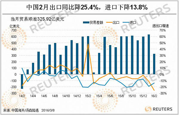 中国海关周二公布,以美元计价,2月出口同比下降25.4%,创2009年5月以来近七年最大降幅,当时为下降26.5%,路透调查预估中值为下降12.5%;2月进口同比下降13.8%,路透调查预估中值为下降10%。