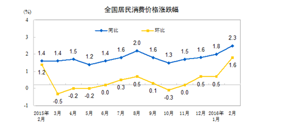 中国2月CPI加速回升至2.3%,创2014年7月来新高。其中鲜菜价格环比上涨29.9%,创2008年3月以来最高涨幅。PPI连续48个月下滑但降幅收窄。国家统计局表示,2月份CPI涨幅主要受寒潮天气和春节因素的双重影响。