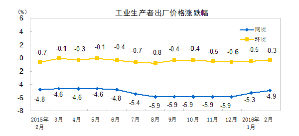 2月份,工业生产者出厂价格同比下降4.9%,降幅比上月缩小0.4个百分点。分行业看,煤炭开采和洗选、黑色金属冶炼和压延加工、石油加工、有色金属冶炼和压延加工、化学原料和化学制品制造出厂价格同比分别下降17.6%、16.2%、14.3%、10.7%、5.9%,合计影响当月工业生产者出厂价格总水平同比下降约2.9个百分点,占总降幅的59%左右。