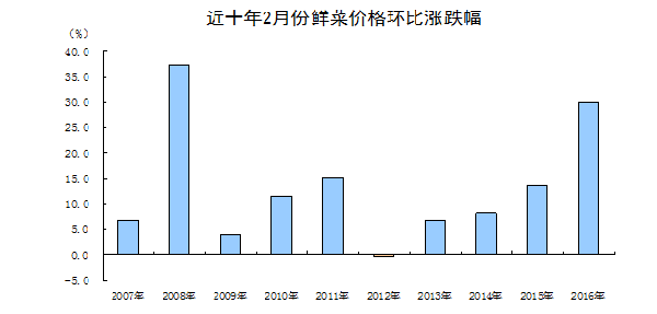 一是寒潮天气推高鲜菜价格。2月中旬全国大部分地区遭遇大风降温和雨雪天气,影响了鲜菜的生产和运输,致使鲜菜价格环比上涨29.9%,创2008年3月以来月度最高涨幅,影响CPI环比上涨约0.84个百分点,超过CPI环比总涨幅的一半。