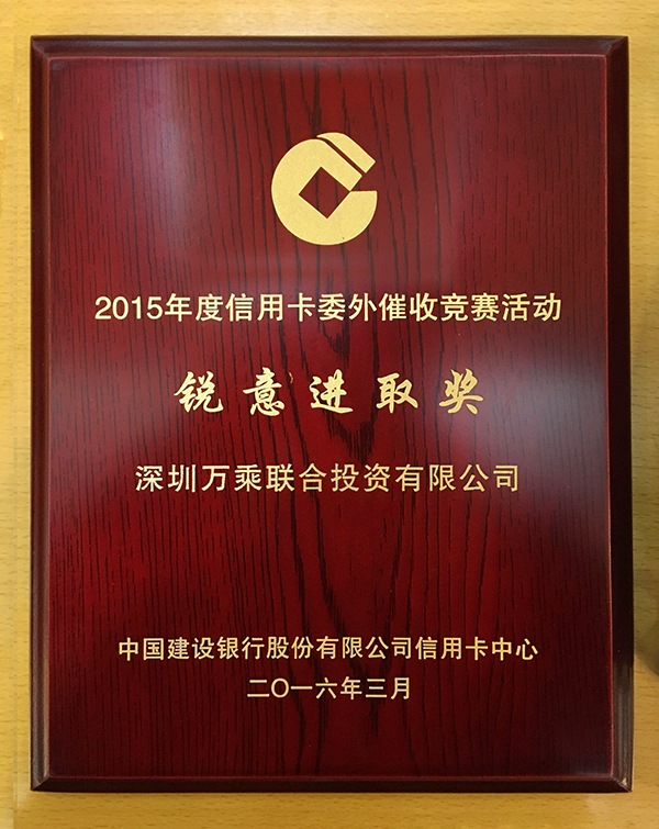 2016年3月31日,深圳万乘联合投资有限公司应邀参加了中国建设银行股份有限公司信用卡中心在江苏常州培训中心召开的2015年度委外催收竞赛颁奖大会,并在建行众多合作厂商中脱颖而出,荣获“锐意进取奖”。集团副总裁崔明绪作为万乘代表领取了奖牌。