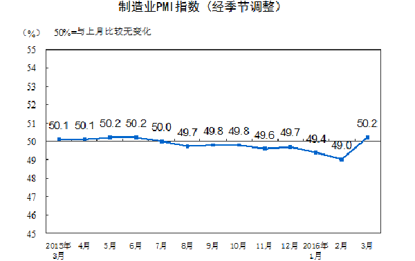 中国3月官方制造业PMI大幅回升至50.2,自去年8月以来首次回到荣枯线以上,预期49.4,前值49.0。统计局称,春节过后企业集中开工,同时进出口市场需求回升,重回扩张状态。同时公布的3月官方非制造业PMI53.8,前值52.7,非制造业加速扩张。