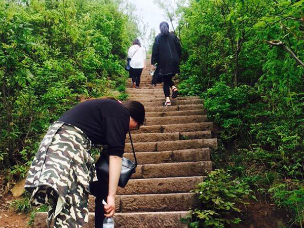 在山脚拍照留影后,大家迈开脚步开始登山了,登山过程中兄弟姐妹们相互鼓励,相互“攀比”,有的甚至脚起泡了还在坚持,登上山顶的兄弟心中都有一种“征服”的快感!