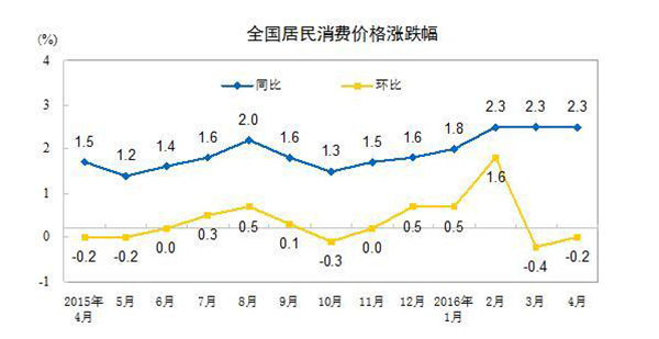 国家统计局10日公布的数据显示,中国4月CPI(居民消费价格)同比+2.3 %,预期+2.3%,前值+2.3%,环比-0.2%。