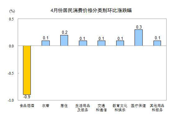 4月份,其他七大类价格环比全部上涨。其中,医疗保健、居住、衣着、生活用品及服务、交通和通信、教育文化和娱乐、其他用品和服务价格分别上涨0.3%、0.2%、0.1%、0.1%、0.1%、0.1%、0.1%。