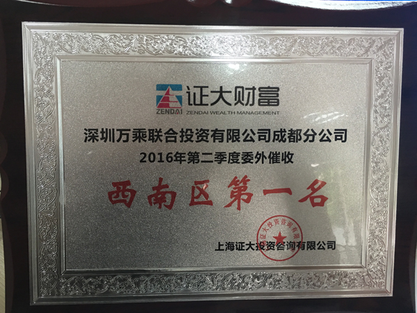 证大财富西南区为加大不良贷款的回收力度,提高贷款回收率,在合作的委外公司之间进行了业绩排名,成都万乘2016年上半年4、5月的任务完成率连续过100%,并且3个月内的平均完成率取得排名第一。2016年7月12日下午,证大财富委外负责人张敏、西南片区负责人李滢、东北片区负责人渐文一行到访成都万乘,并授予成都万乘“2016年第二季度委外催收西南区第一名”荣誉证书。成都万乘小贷组业务主管刘春贵热情接待了来访客人。
