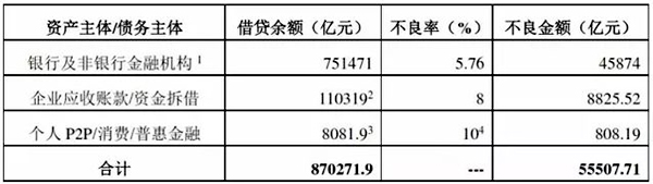 不良资产因借贷主体或债务主体的不同而形成了不同的处置办法和催收思路,业内通常习惯于将不良资产划分为三类,具体分类和不良金额列表如下: