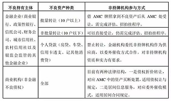 目前,针对银行和非银行金融机构的不良资产主要由四大AMC(东方、长城、华融、信达)以及18家地方AMC完成。现在部分城商行和全国性商业银行将个人信用卡不良债务委托律师事务所或专业催收公司代理催收。但就占比和金额而言,AMC仍然是银行不良资产处置的主流形式。据了解,银行现在的真实不良资产远大于银监会的账面统计金额,其往往通过各种金融工具和通道完成不良出表,但并未真正处置不良资产,民营机构受限于法律监管和国资要求,尚不能完全进入银行不良处置市场。