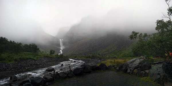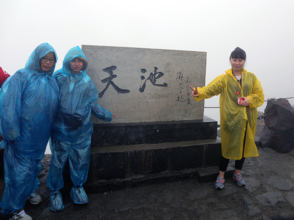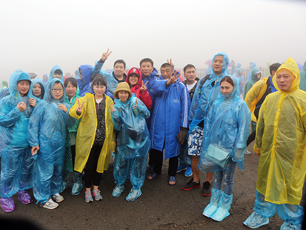 吃过午饭我们来到了第一个景点——长白山西坡。虽然一路上都在下雨,看到天池的可能性微乎其微,我们还是毅然决然地爬了1442个台阶来到了天池观景台,神秘的天池因为我们的到来越发显得扑朔迷离,像是和我们捉迷藏躲在茫茫的雾气下,不肯露出面目。带着遗憾和期待的心情大家下山了,俗话说“上山容易下山难”,真的是这样,因为风雨交加,下山雨水迎面拍打在身上,下到山脚每个人都是湿哒哒的。