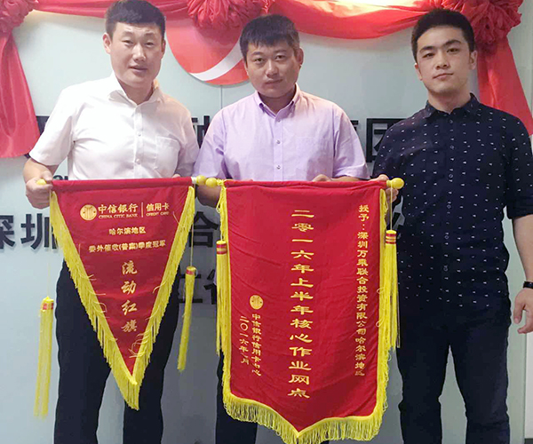 2016年8月22日上午,中信银行信用卡中心赵主任、李经理莅临黑龙江万乘,并授予黑龙江万乘“2016年上半年核心作业网点”锦旗;同时,由于黑龙江万乘获得第二季度业绩冠军,特此颁发“流动红旗”。