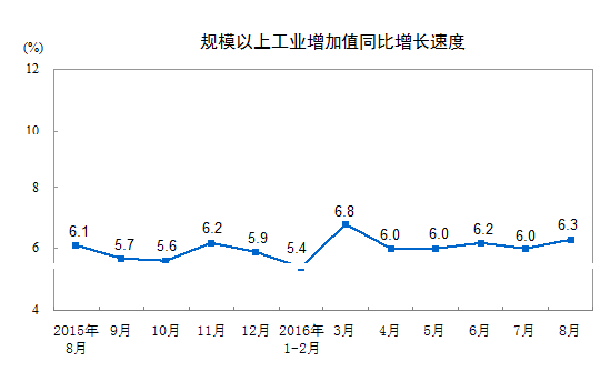 8月份,规模以上工业增加值同比增长6.3%,环比增长0.53%。