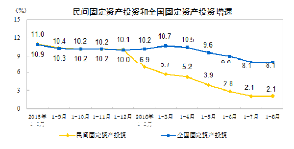 1-8月份,民间固定资产投资225005亿元,同比名义增长2.1%,增速与1-7月份持平。