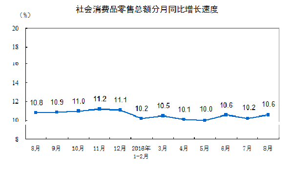 1-8月份,社会消费品零售总额210505亿元,同比增长10.3%。