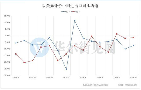 海关总署今日公布的数据显示,按美元计,中国10月出口同比下滑7.3%,为连续第七个月下滑,差于预期的下滑5.9%,前值为下滑10%;10月进口同比下滑1.4%,也差于预期的下滑1%,前值为下滑1.9%;10月贸易顺差490.6亿,预期517亿,前值419.9亿。