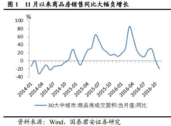 来自国泰君安的数据显示,受限购限贷政策效果持续显现影响,11月以来,商品房销售同比降幅迅猛扩大。继10月30城市商品房成交面积同比(-1%)首次转为负区间后,11 月1-17日进一步大幅回落至-19.5%。其中,一线(-24.1%)、二线(-20.4%)、三线(-13.2%)均大幅负增长,一线二线三线顺次从9月、10月、11月起转为负增长。