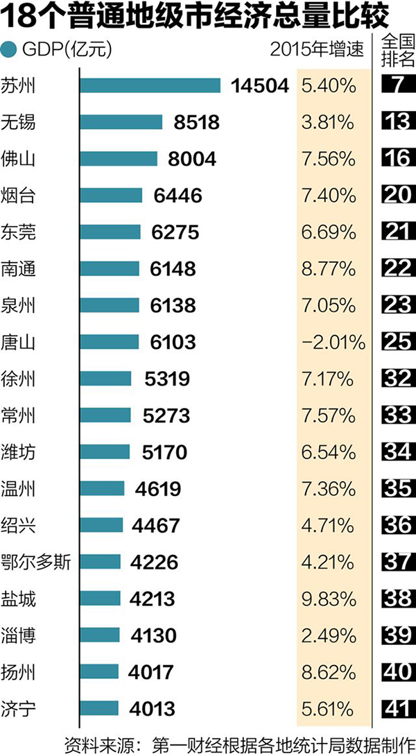 撇开直辖市、计划单列市和省会城市,通过对普通地级市的经济总量统计发现,共有18个城市的经济总量超过了4000亿大关,其中苏州是唯一一个超过1万亿大关的地级市。从地域分布上看,江苏最多,共有7个,而广东只占两个。在人均GDP上,鄂尔多斯超过20万元。