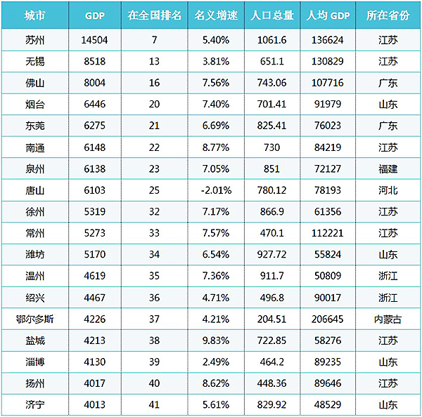三甲之后,来自第三经济大省山东的烟台位居第四,去年经济总量达到了6446亿元;来自广东的“世界工厂”东莞目前位居第5。