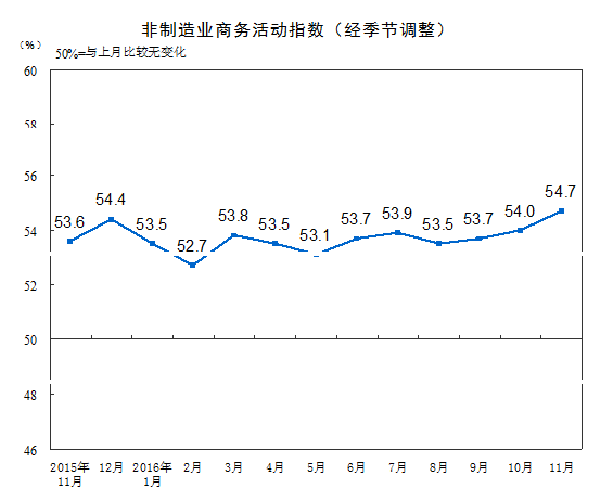 11月份,中国非制造业商务活动指数为54.7%,比上月上升0.7个百分点,连续三个月上升,为2014年7月以来的高点,非制造业延续了平稳较快的增长势头,增速进一步加快。