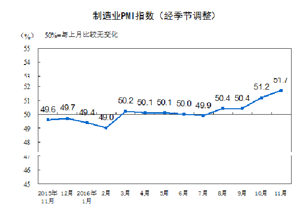 2016年11月份,中国制造业采购经理指数(PMI)为51.7%,比上月上升0.5个百分点,延续上行走势。