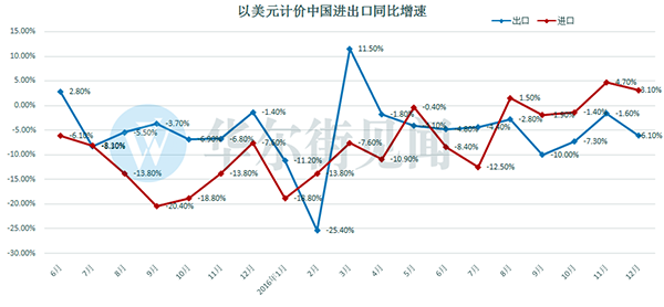 全年来看,中国2016年出口按人民币计同比下降2%,2016年进口按人民币计同比增长0.6%;全年贸易顺差3.35万亿元人民币,同比减少9.1%。而2016年四季度进出口、出口、进口值分别增长3.8%、0.3%和8.7%。