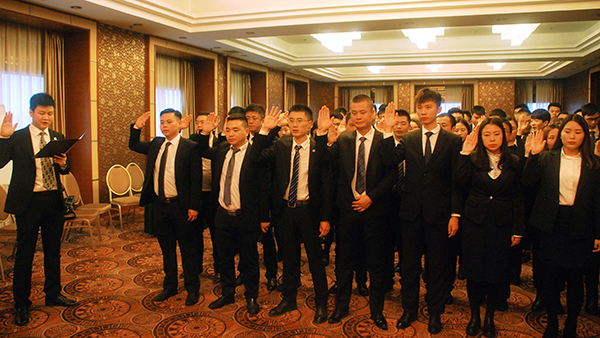 最后,成都万乘全体员工在总经理助理白海的带领下郑重宣誓:我将在成都万乘总经理室的带领下,弘扬万乘狼性精神,团结一心,恪尽职守,不畏艰辛,奋勇拼搏,确保2017年各项工作指标顺利完成。