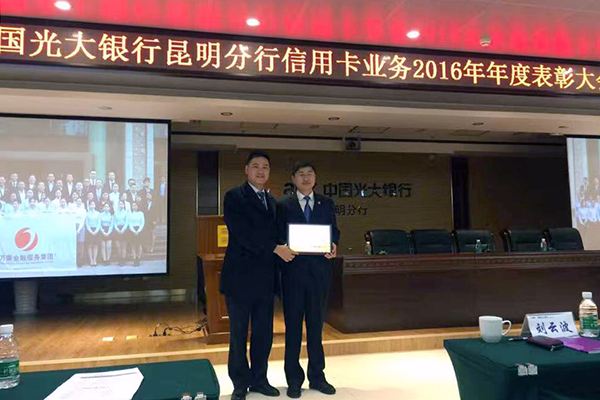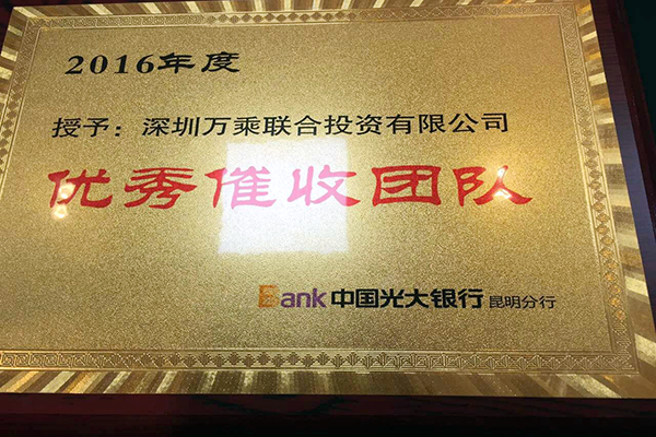 2017年1月19日,中国光大银行昆明分行对万乘昆明团队在2016年所取得的优异成绩给予了极大的认可,并授予昆明万乘“优秀催收团队”奖牌。