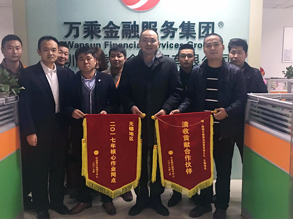 2017年2月8日,中信银行信用卡中心无锡分中心领导黄总、鲁经理、韩经理一行莅临无锡万乘检查指导工作,并代表分中心授予无锡万乘“二○一七年核心作业网点”及“清收贡献合作伙伴”两面锦旗。无锡万乘总经理郭宝万、副总经理徐晓东陪同接待并参加授旗仪式。