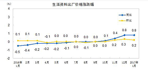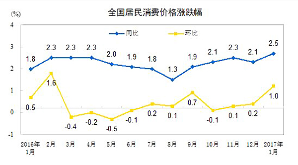 国家统计局今日公布的数据显示,2017年1月份,全国居民消费价格总水平同比上涨2.5%。其中,城市上涨2.6%,农村上涨2.2%;食品价格上涨2.7%,非食品价格上涨2.5%;消费品价格上涨2.2%,服务价格上涨3.2%。