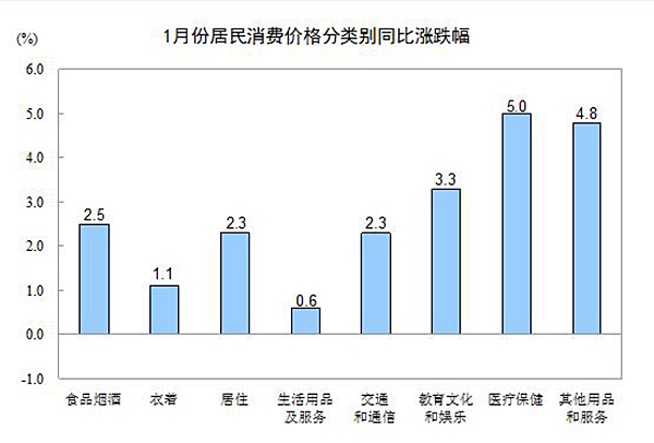 1月份,其他七大类价格同比均有所上涨。其中,医疗保健、其他用品和服务、教育文化和娱乐、居住、交通和通信、衣着、生活用品及服务价格分别上涨5.0%、4.8%、3.3%、2.3%、2.3%、1.1%和0.6%。