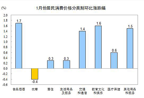 1月份,其他七大类价格环比六涨一降。其中,教育文化和娱乐、其他用品和服务、交通和通信、医疗保健、居住、生活用品及服务价格分别上涨1.6%、1.5%、1.4%、0.6%、0.3%和0.3%;衣着价格下降0.4%。