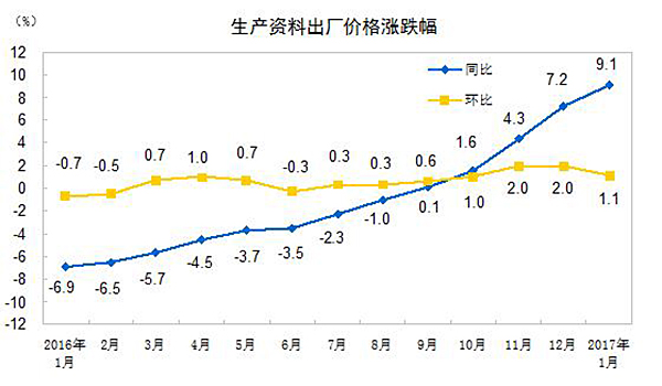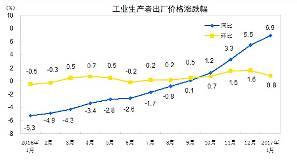 从同比看,1月份PPI上涨6.9%,涨幅比2016年12月份扩大1.4个百分点。在调查的40个工业大类行业中,33个行业产品价格同比上涨,比上月增加1个。其中,石油和天然气开采、煤炭开采和洗选、黑色金属冶炼和压延加工、石油加工、有色金属冶炼和压延加工、化学原料和化学制品制造业价格同比分别上涨58.5%、38.4%、37.7%、24.4%、17.3%和9.2%,涨幅比上月分别扩大38.8、4.4、2.7、7.8、0.2和2.6个百分点,合计影响PPI同比上涨约5.7个百分点,占总涨幅的82.6%。