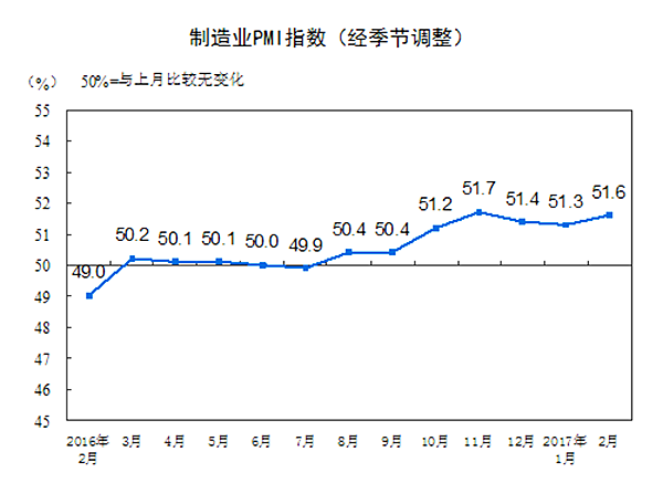 2017年2月份,中国制造业采购经理指数(PMI)为51.6%,比上月上升0.3个百分点,制造业继续保持稳中向好的发展态势。