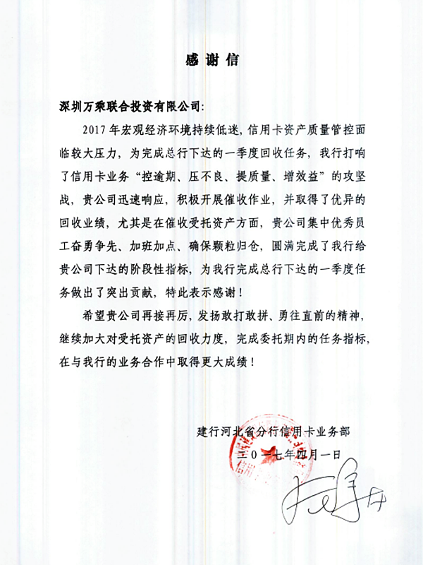 信中,建行河北省分行对石家庄万乘在2017年第一季度圆满完成了催收受托指标,同时也为省分行完成总行的第一季度任务做出了突出贡献表示感谢,另寄语我司今后再接再厉,争取取得更好的成绩。