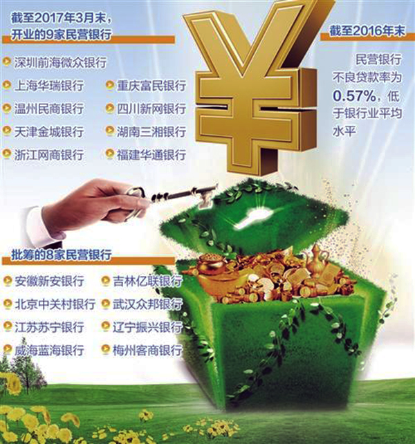 目前,民营银行设立已实现常态化。截至3月末开业的9家民营银行分别为深圳前海微众、上海华瑞、温州民商、天津金城、浙江网商、重庆富民、四川新网、湖南三湘、福建华通银行,批筹的8家为安徽新安、北京中关村、江苏苏宁、威海蓝海、吉林亿联、武汉众邦、辽宁振兴、梅州客商银行。