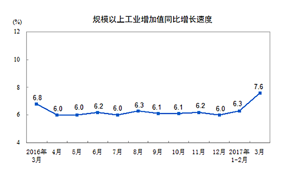 一季度,全国规模以上工业增加值同比实际增长6.8%,增速比上年同期加快1.0个百分点,比上年全年加快0.8个百分点。分经济类型看,国有控股企业增加值增长6.2%,集体企业增长0.5%,股份制企业增长6.9%,外商及港澳台商投资企业增长6.9%。分三大门类看,采矿业增加值同比下降2.4%,制造业增长7.4%,电力、热力、燃气及水生产和供应业增长8.9%。工业结构继续优化,高技术产业和装备制造业增加值同比分别增长13.4%和12.0%,增速分别比规模以上工业快6.6和5.2个百分点,比上年全年快2.6和2.5个百分点。规模以上工业企业产销率达到97.2%。3月份,规模以上工业增加值同比增长7.6%,比1-2月份加快1.3个百分点,环比增长0.83%。