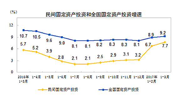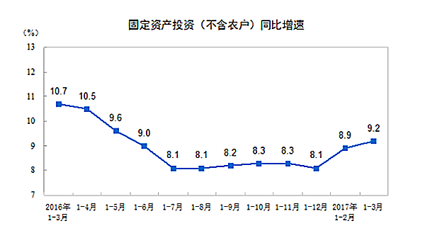 “三去一降一补”取得新进展。一季度,规模以上工业产能利用率为75.8%,比上年四季度提高2.0个百分点。原煤产量同比下降0.3%。3月末,商品房待售面积同比下降6.4%,降幅比上年末扩大3.2个百分点。工业企业资产负债率及成本下降,2月末规模以上工业企业资产负债率为56.2%,同比下降0.6个百分点;1-2月份规模以上工业企业每百元主营业务收入中的成本为84.91元,同比减少0.28元。短板领域投资加快,一季度生态保护和环境治理业、公共设施管理业、农业、水利管理业投资分别增长48.1%、27.4%、24.6%和18.3%,分别快于全部投资38.9、18.2、15.4和9.1个百分点。