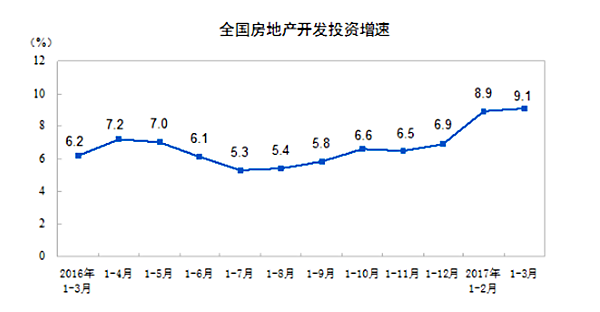 一季度,全国房地产开发投资19292亿元,同比增长9.1%,增速比上年全年加快2.2个百分点,比今年1-2月份加快0.2个百分点;其中,住宅投资增长11.2%。房屋新开工面积31560万平方米,同比增长11.6%,其中住宅新开工面积增长18.1%。全国商品房销售面积29035万平方米,增长19.5%,其中住宅销售面积增长16.9%。全国商品房销售额23182亿元,增长25.1%,其中住宅销售额增长20.2%。房地产开发企业土地购置面积3782万平方米,同比增长5.7%。3月末,全国商品房待售面积68810万平方米,比2月末减少1745万平方米。一季度,房地产开发企业到位资金35666亿元,同比增长11.5%。