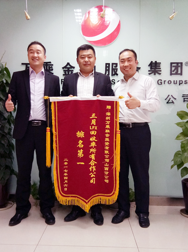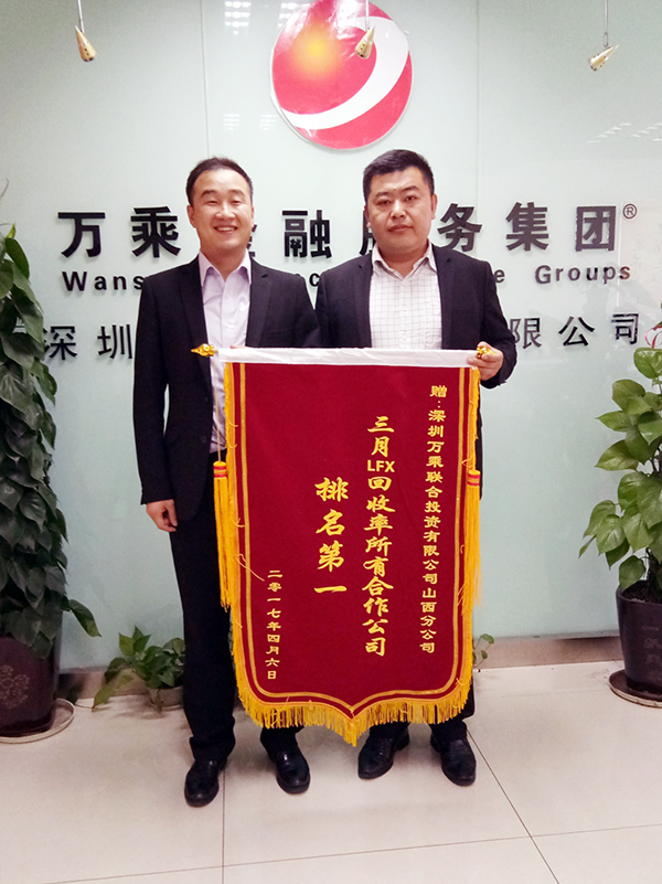 2017年4月25日,平安普惠张总携乔经理莅临山西万乘,为山西万乘颁发“三月LFX回收率所有合作公司排名第一”的锦旗,山西万乘总经理王龙热情接待了来访客人。