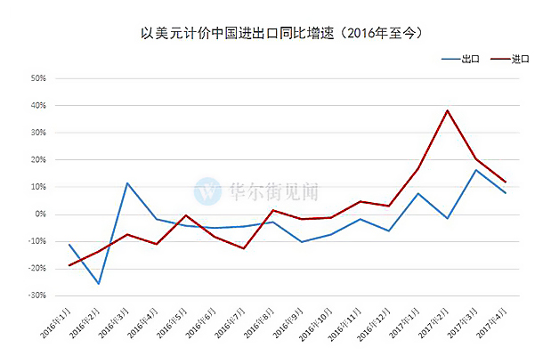 出口同比增长14.3%,略弱于预期的16.8%,主要原因在于美国4月经济出现一定幅度的季节性调整,比如4月美国PMI 54.8,大幅低于3月的57.2,美国CPI也出现了去年7月以来的首次回落,降低了0.3个百分点。对此,我们认为,尽管美国经济出现回落,但是主要原因在于季节性调整,另外在于美国从2016年7月以来经济复苏的幅度较快,4月出现一定的调整是正常的,所以,4月出口的走弱可能只是短期的现象,此外,日欧经济的复苏好转也同样会支撑之后中国出口的走好。