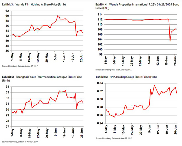 6月22日财新报道称,中国银监会于6月中旬要求各家银行排查包括万达、海航集团、复星、浙江罗森内里在内数家企业的授信及风险分析,排查对象多是近年来海外投资比较凶猛、在银行业敞口较大的民营企业集团。这些企业发行的在岸和离岸证券价格随即遭遇严重下行压力(下图),直到26日交易才大致恢复稳定,但均未能恢复到22日的水平。